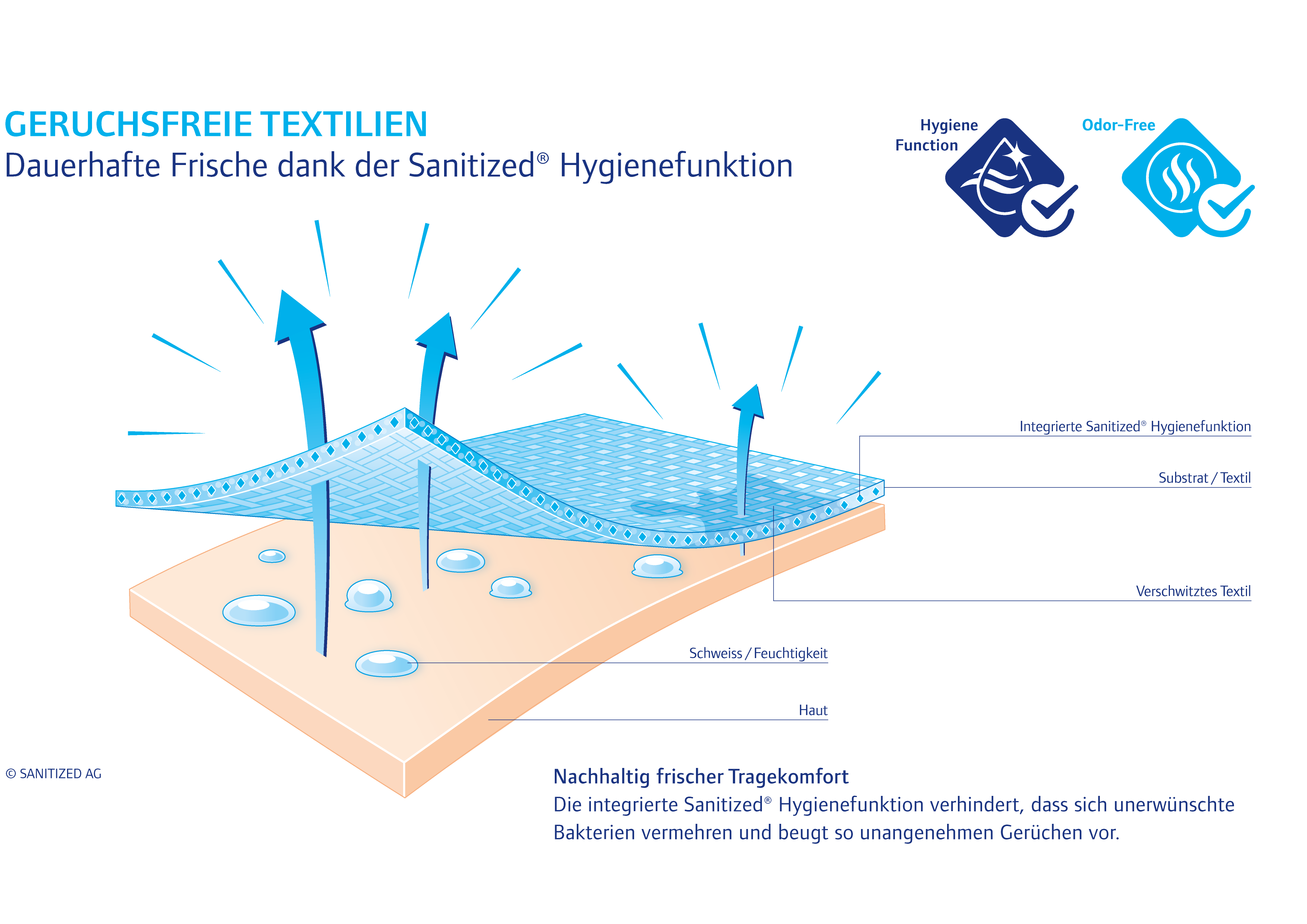 Seit über 80 Jahren steht die Marke Sanitized® des Schweizer Unternehmens SANITIZED AG für Frische, Komfort und Materialschutz. Neben umfassendem Geruchsmanagement reduziert die Sanitized® Hygienefunktion Milben und Bakterien in Textilien, Kunststoffen, Oberflächen und Matratzen und schützt zuverlässig vor Schimmel- und Algenbildung. Darüber hinaus bietet die Behandlung mit entsprechenden Additiven Farben und Polymeren einen langanhaltenden Materialschutz.
