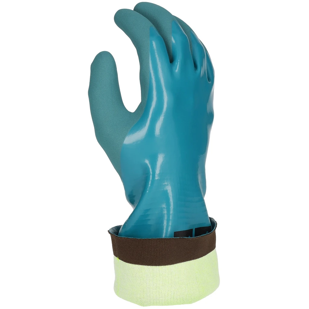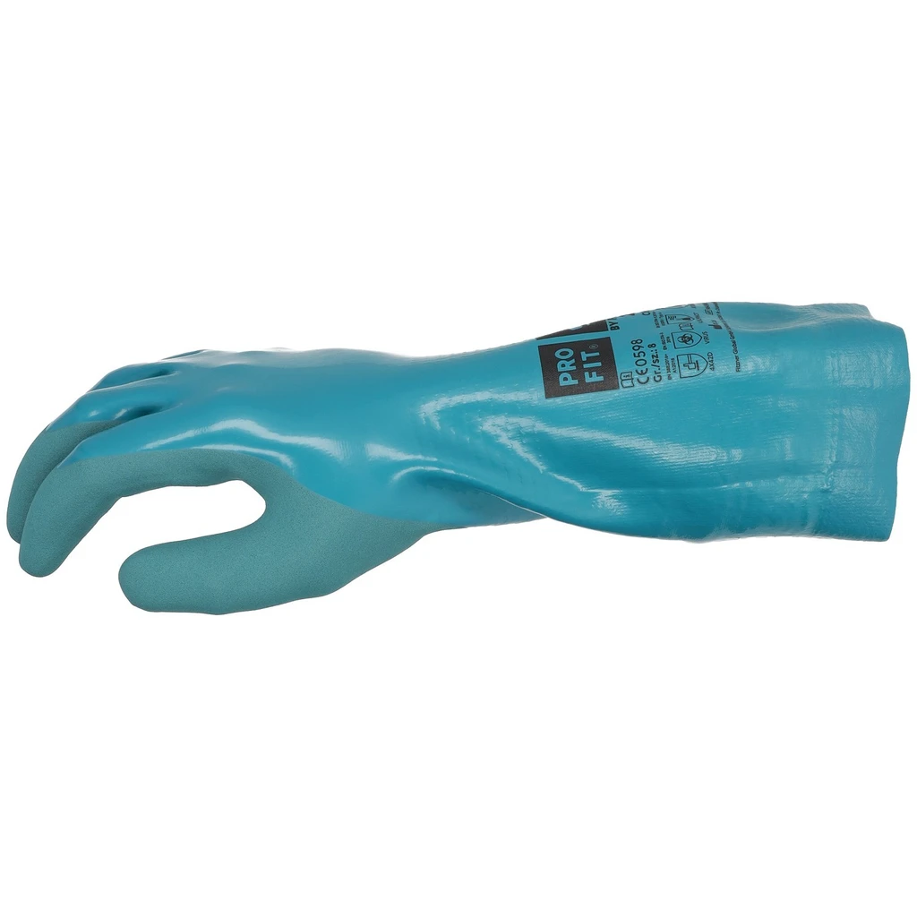 Nitril Chemikalienschutzhandschuh "Chem" mit Schnittschutz D – kompromissloser Schutz unter harten Bedingungen Im Bereich Arbeitsschutz werden keine halben Sachen gemacht – und schon gar nicht, wenn es um die Auswahl des passenden Chemikalienschutzhandschuhs in Kombination mit Schnittschutz geht. Mit dem türkisen Modell aus der PRO FIT Produktreihe wird nicht nur Design, sondern vor allem Funktionalität auf die sprichwörtliche Spitzenleistung getrieben. Auf kompromisslose Performance darf hier gebaut werden, denn der Arbeitshandschuh überzeugt durch seine flüssigkeitsdichte Nitril Vollbeschichtung. So bleibt nicht nur die Haut trocken, sondern auch potenziell gefährliche Chemikalien haben keine Chance. Mit einer zusätzlich integrierten, gesandeten Nitrilschaum-Beschichtung auf der Handinnenfläche für Extra-Grip, wird auch das rutschigste Problem fachmännisch in den Griff genommen. Ob feuchte Oberflächen, ölverschmiertes Werkzeug oder in fettigen Umgebungen – das Handling bleibt sicher. Wer schon einmal versucht hat, ein rutschiges Werkzeug festzuhalten, weiß die hohe Rutschfestigkeit und damit die Sicherheit dieses Spezialisten zu schätzen. Maximaler Schutz muss nicht unbequem sein: Das ultraleichte Trägermaterial aus HPPE, SteelFiber, Polyester und Spandex sowie die nahtlose Grifffläche garantieren langanhaltenden Tragekomfort und minimieren Ermüdungserscheinungen – Alltagstauglichkeit auf höchstem Niveau. Der Chemikalienschutzhandschuh glänzt mit einem starken Zweifachschutz, denn der Handschuh dient auch als Schnittschutzhandschuh (ISO Schnittlevel D), der sich ganz besonders bei Tätigkeiten bewährt, bei denen Chemikalienschutz erforderlich ist und zugleich die Gefahr von Schnittverletzungen besteht. Das markante, gelbe Trägermaterial sorgt zudem dafür, dass etwaige Beschädigungen der Beschichtung sofort erkannt werden. Die ca. 35 cm Länge schützt zusätzlich den Unterarm und vervollständigt das durchdachte Sicherheitskonzept dieses Modells ab. Zertifiziert nach EN ISO 374 Typ A, schützt die Nitril-Barriere zuverlässig gegen gängige Chemikalien – ganz nebenbei wird ebenso ein effektiver Schutz gegen Mikroorganismen geboten. Abgerundet wird das Multitalent durch einen Kontakthitzeschutz bis 100°C, exzellente Abriebfestigkeit und ein Fingerspitzengefühl, das selbst Präzisionsarbeiten problemlos meistert - der Chemikalienschutzhandschuh kombiniert das Beste aus allen Welten.